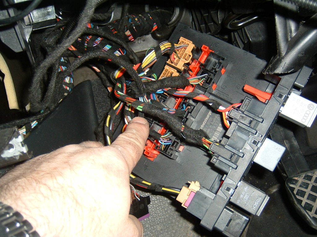 U BSG najdeme svorkovnici T6a – černá a na ní zeleno červený a zeleno bílý vodič na tyto vodiče připojíme vodiče stejné barvy z kabeláže, kterou táhneme od stěrače, černo fialový dotáhneme k pojistkové skříni, kde jej zaústíme do pozice 41 a osadíme pojistkou 15A.