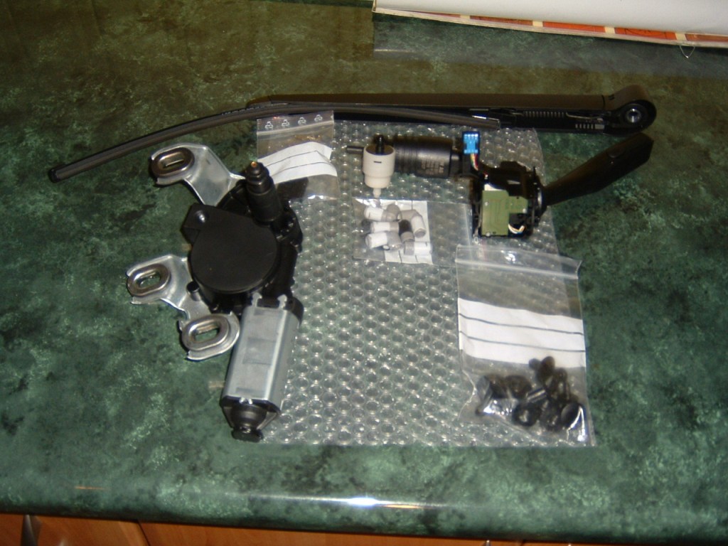Před samotnou montáží je potřeba sehnat motorek stěrače s ramínkem, kryt na 5. dveře pro stěrač, hadičku na výstřik do 5. dveří a mezi nádobkou a svorkou v kufru, dále motorek s dvoj vývodem, páčku pod volant, 3 sekce kabeláže (nejlépe vyndat na vrakovišti), cca 20 ks zcukapásek a 3 ks matek na upevnění motorku k 5. dveřím.