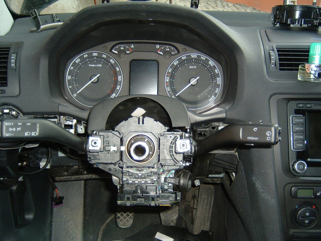 Sejmeme volant (shodně jako u Octavia I viz návod jak rozebrat interiér nebo návod jak dodělat palubní počítač), obložení volantové tyče drží na 3 ks šroubů, rozebereme pod modul pod volantem, vyměníme páčku stěračů, nahradíme jí novou a vše zase složíme