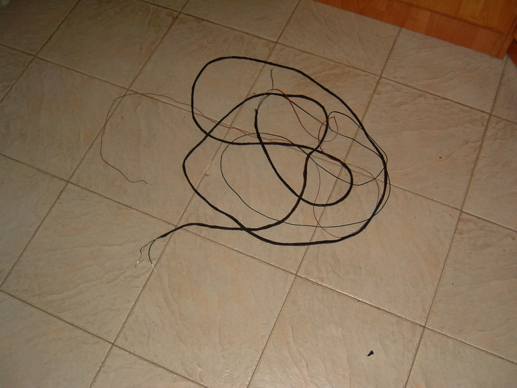 Nyní protáhneme kabeláž s hadičkou od motorku L profilem 5. dveří a přes průchodku kolem C sloupku ke svorkám v kufru, vše přichytíme pomocí zcuka pásek ke stávající kabeláži. Od svorek v kufru kabeláž s hadičkou táhneme kolem L prahu až pod palubku, celou cestu přichytíme opět páskami. Hadičku výstřiku pak táhneme dírou v mezistěně do meziprostoru a dále kolem kabelového svazku k nádobce (je potřeba sundat přední nárazník), zde vyměníme motorek.